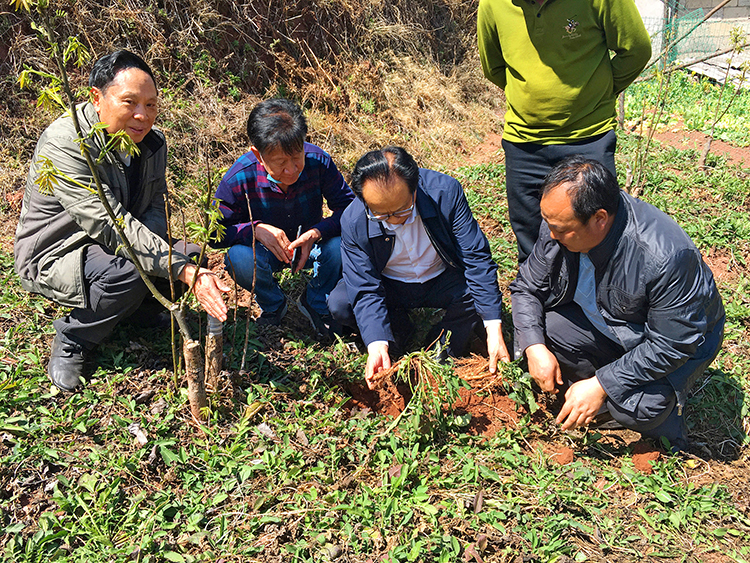 2020年3月26日,全國人大代表耿福能(左三)在涼山彝族自治州普格縣特爾果鄉(xiāng)督戰(zhàn)復(fù)工復(fù)產(chǎn)。圖為耿福能在查看川續(xù)斷種苗。